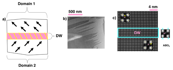 c) Illustration of an atomic resolution image of a DW (High Angle Annular Dark Field imaging mode) in a perovskite ferroelectric (with the chemical formula ABO3). The image is acquired with the electron beam along the [100] pseudo-cubic crystallographic direction. In this representation, atomic columns corresponding to A and B sites are seen. The displacement of B site atomic column in respect to A-site sublattice is a quantity proportional to the polarization vector and, as it can be seen, it points on a different direction on each side of the DW (yellow arrow).