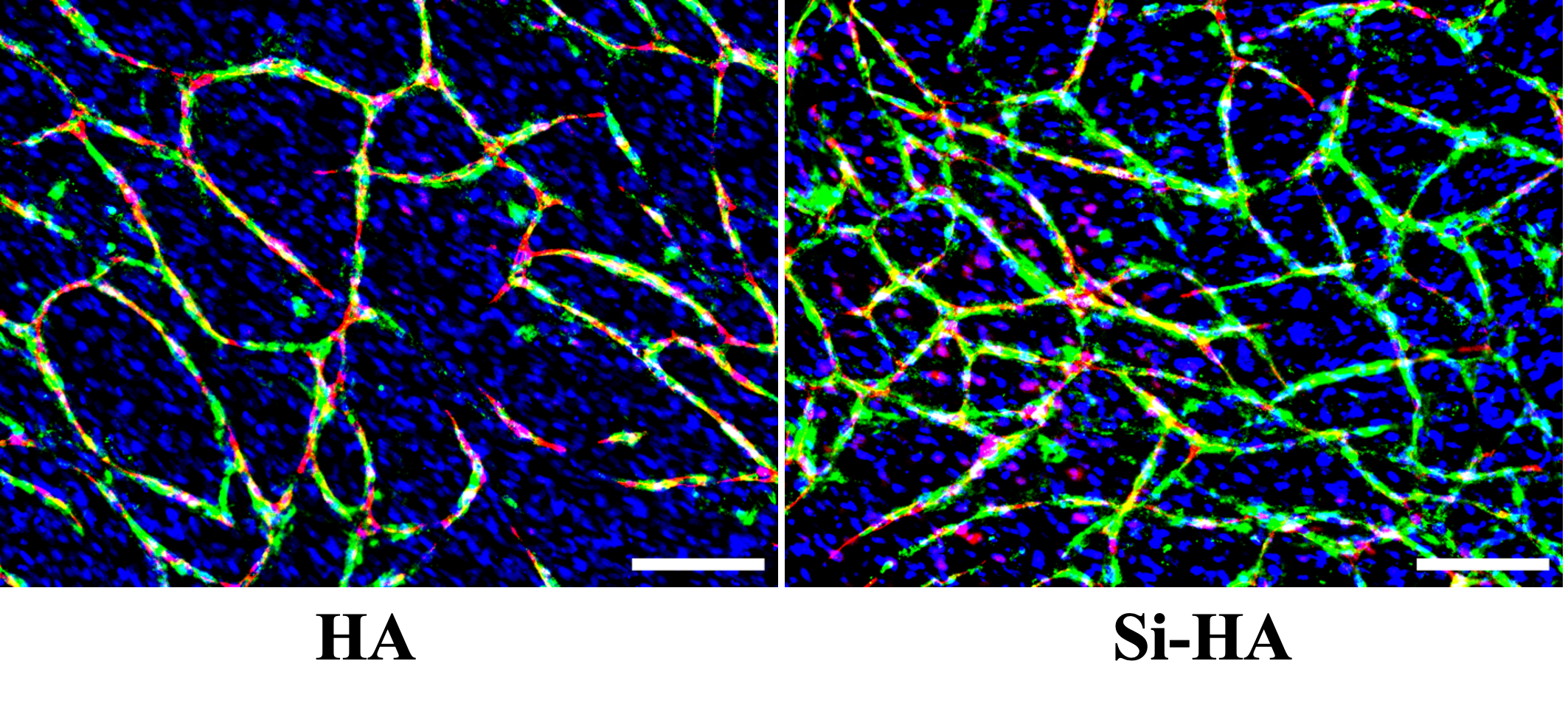 Figure: Fluorescent images of Si-HA and HA discs co-cultured with an OB:EC cell ratio of 70:30 (scale bar indicates 150 µm). Red: CD31 staining, Blue: DAPI nuclei staining, Green: von Willebrand Factor.
