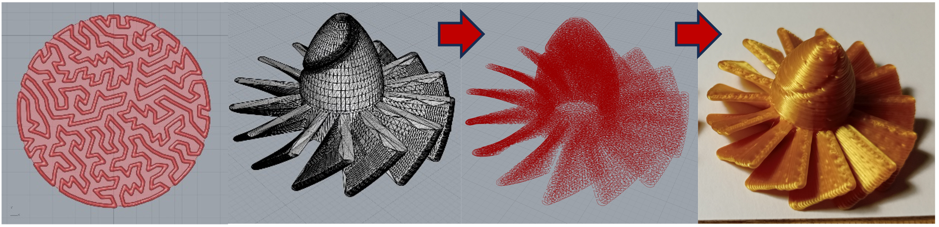 Example of a Differential Growth pattern generated through Grasshopper3D (left); automated generation of continuous toolpaths from a geometrically complex CAD model and PLA prototype printed by entirely continuous extrusion (right)