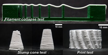 Examples of qualitative tests to assess the printability of alumina-based filaments produced by Direct Ink Writing.